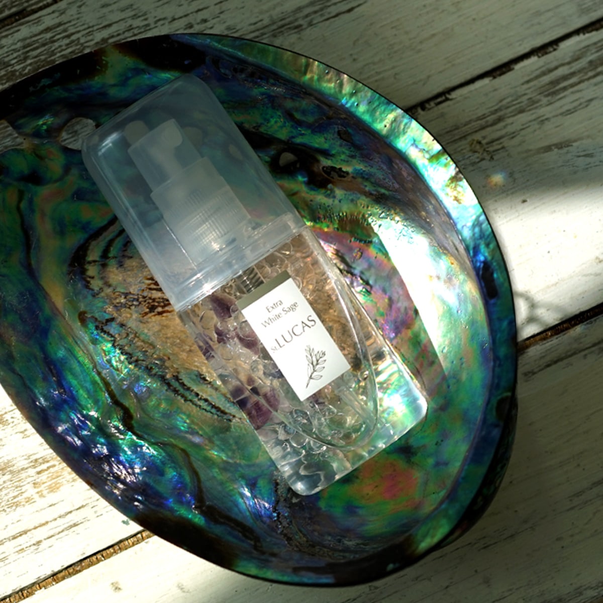 LUCAS(ルカス)は自然界の浄化成分であるホワイトセージから抽出したエッセンシャルオイルを配合した、天然石がキラキラ輝く、浄化・リフレッシュ用スプレーです。